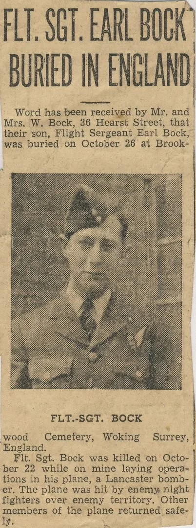 Earl Bock was on Lancaster LN689 and that story is of particular significance to IBCC. Earl was one of around 300 servicemen who were killed on board aircraft that made a safe return to base, according to research by Dave Gilbert, Losses Archivist, IBCC.